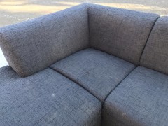 Mooie hoekbank kleur Antraciet/grijzig. De hoekbank kan in twee delen uit elkaar. Beide delen zijn 165cm lang en 93 cm breed. Bij elkaar is de bank dus ongeveer 258cm breed. De bank zit en ligt nog perfect en is dus ook niet door gezakt. Op sommige plekken zitten er wel haken in de stof.