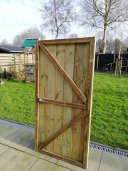 Nieuwe schuttingdeur. De afmetingen zijn 180 x 90. Mooie dichte deur en dik framewerk, geen goedkope bouwmarkt kwaliteit. Is geïmpregneerd en is voorzien van een boerenklinkset. Is zowel verlijmt als geschroeft.